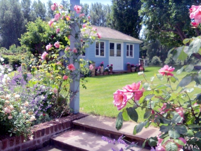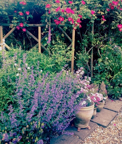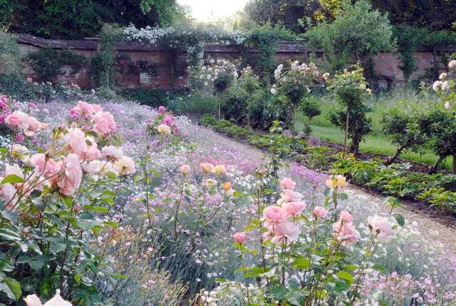 walled garden with a vine, herbaceous plantings, roses, shrubs and